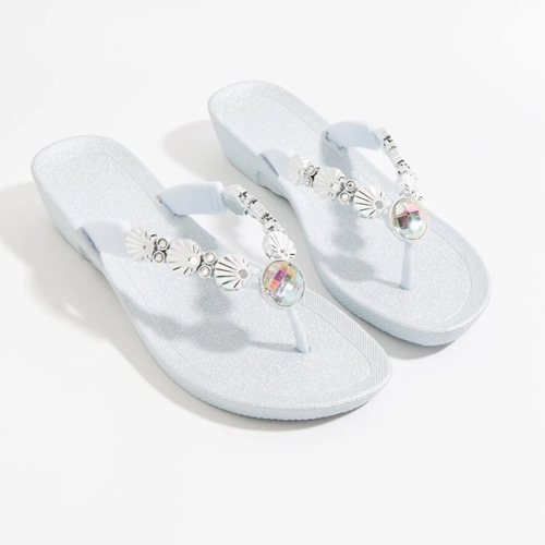 Add a touch of glamour and sparkle to your holiday wear with Pia Rossini wedges. These white wedged flipflops have diamante stones & silver shell detail along the footstrap and a smallwedge.